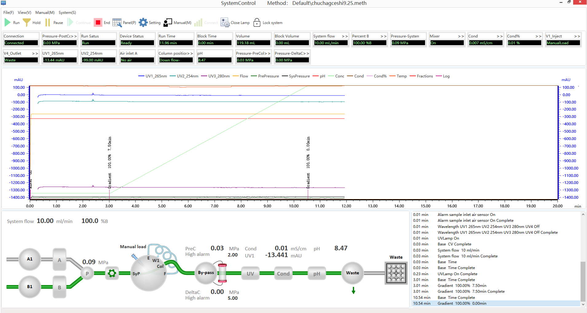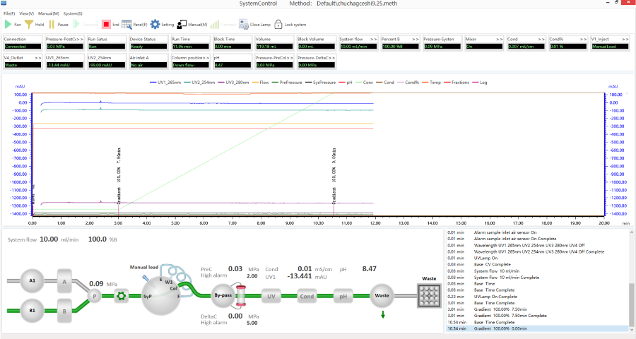 Хроматограф имеет один двухплунжерный насос до 100 мл/мин с возможностью создания градиента на стороне низкого давления, необходимые детекторы, включая УФ-детектор (200-400 нм, 2 длины волны), датчики pH и электропроводности с температурной компенсацией. К хроматографической системе возможно подключение коллектора фракций с разными коллекторными стойками, что обеспечивает удобство сбора и анализа образцов.