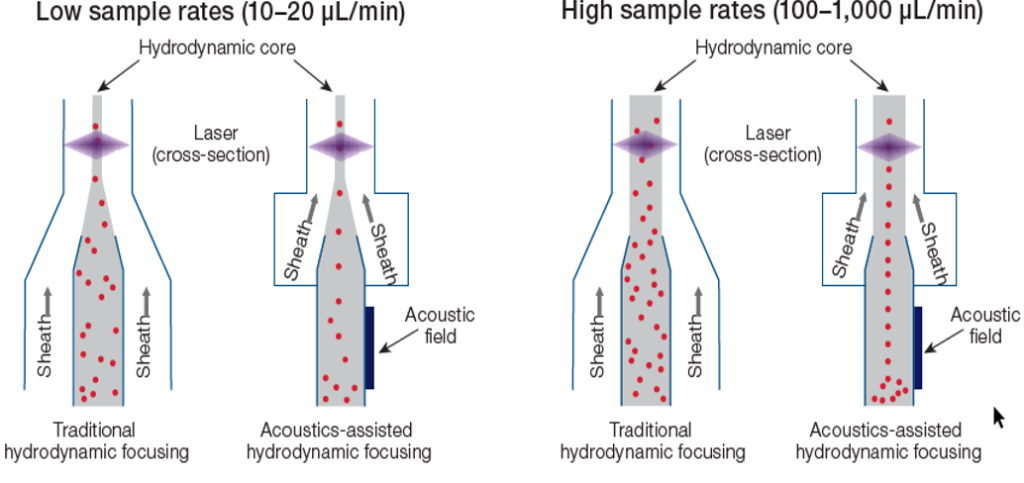 В процессе анализа клетки выстраиваются в линию и последовательно на высокой скорости проходят через точку опроса для получения спектра комбинационного рассеяния. После получения спектров собираются только клетки (или микрокапли, содержащие отдельные клетки) с целевыми спектрами комбинационного рассеяния света (т.е. целевыми метаболическими функциями). Пропускная способность FlowRACS в настоящее время составляет 300-600 клеток/мин.