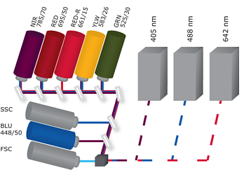 Система детекции позволяет работать как с самыми популярными красителями (FITC, Alexa 488, PE, PI), так и тандемными красителями (PE-Texas Red, PE-Cy5, PE-Cy5.5, PE-Cy7), что позволяет реализовать простые мультиплексные эксперименты.
