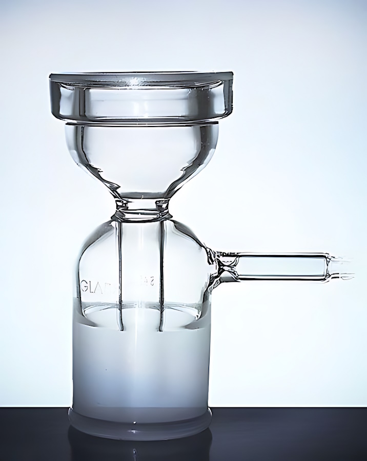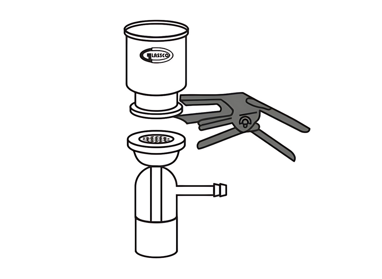 Основание для держателя фильтров с диаметром 47 мм из боросиликатного стекла с коннектором для вакуума и фритованной стеклянной подложкой.