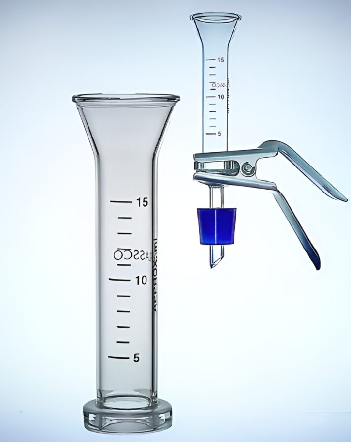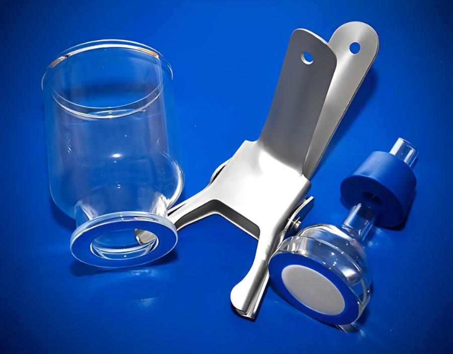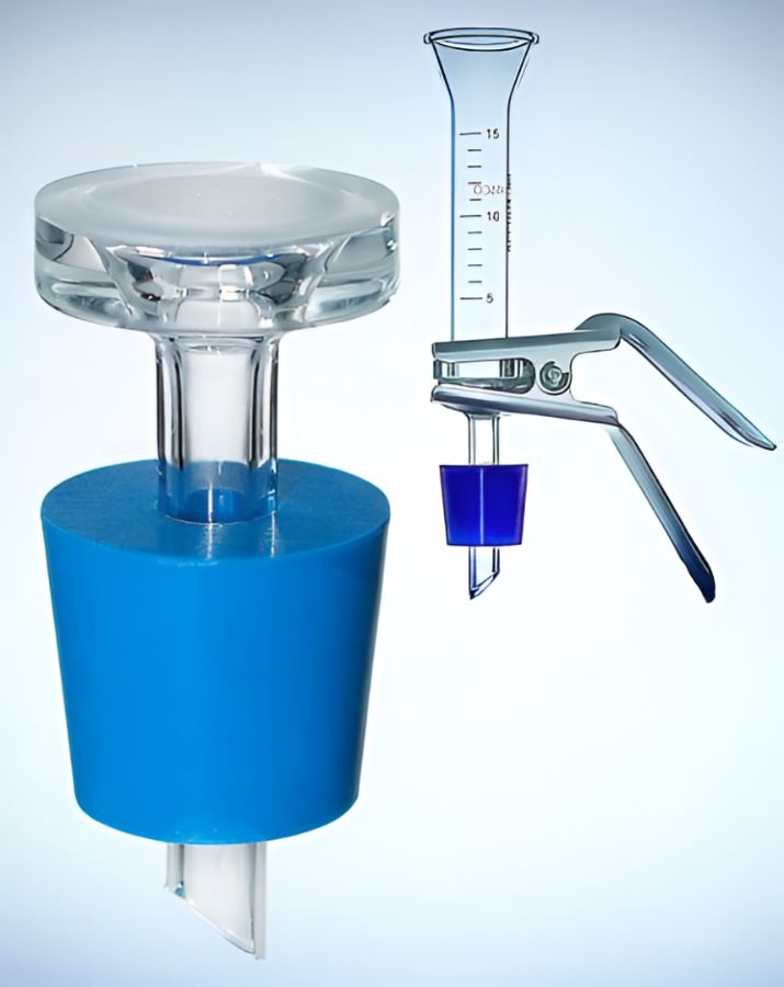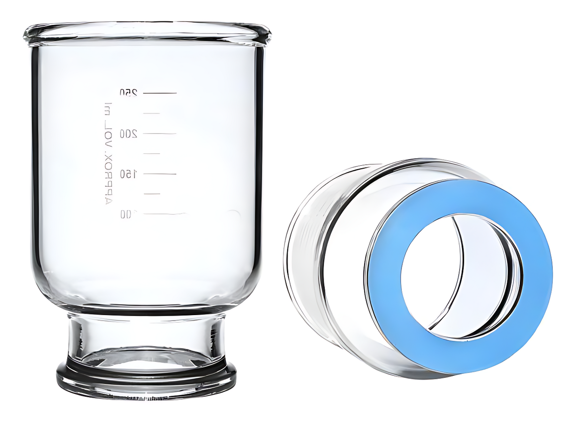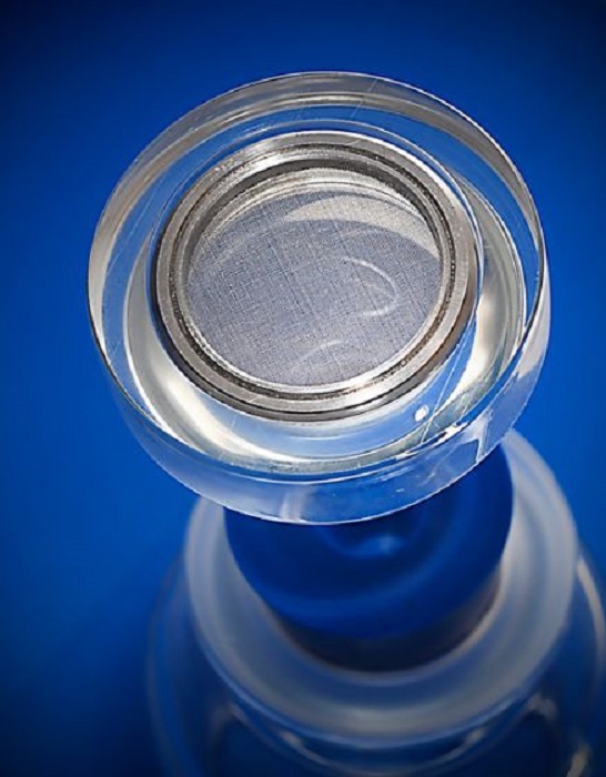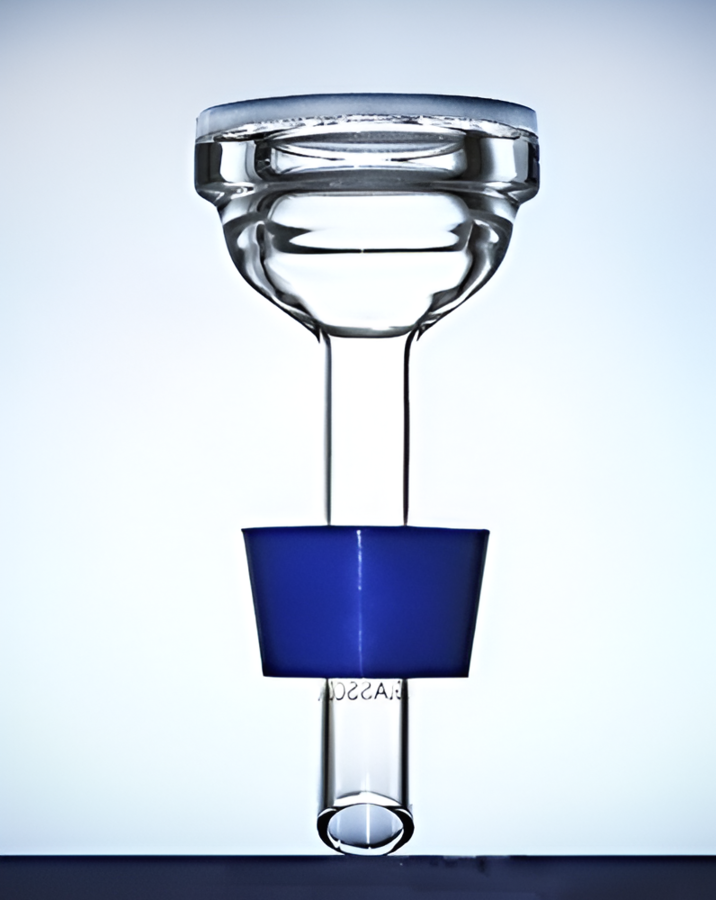 Основание для держателя фильтров с диаметром 25 мм из боросиликатного стекла с фритованной стеклянной подложкой и пробкой из силикона.