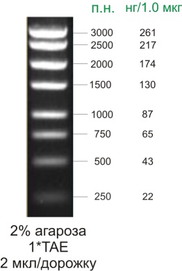 Маркер молекулярного веса ДНК содержит 8 фрагментов от 250 до 3000 п.н.; фрагменты 250, 500, 750, 1000, 1500, 2000, 2500 и 3000 п.н.; концентрация ДНК-маркера — 0,1 мг/мл; предварительно смешан с буфером для нанесения; рекомендуемый объём для нанесения на гель — 2 мкл; условия хранения: -20 °C.