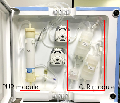 Для работы системы необходимо использование одновременно двух одноразовых модулей: PUR02 и CLR. Модуль CLR нужен для фильтрации примесей крупных частиц, а модуль PUR непосредственно для концентрации и очистки экзосом. Кроме того, модуль R011-PUR-03 можно использовать повторно, несколько раз при правильном обращении и регенерации.
