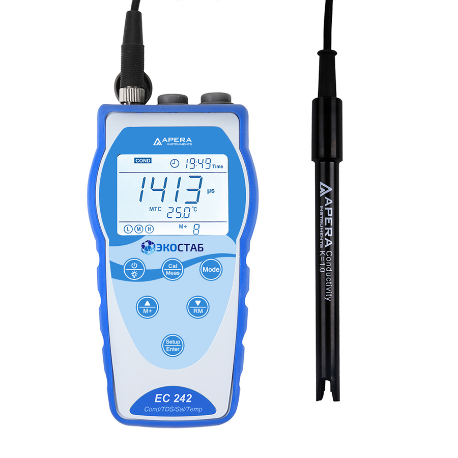 Стационарный кондуктометр ЕС21хх создан для измерения удельной электропроводности, солености, температуры. Модель серии 2100 считается надежной, простой в использовании, она имеет функцию автоматически настраиваемой или ручной температурной компенсации, которая срабатывает в диапазонах от 0 до 50° или от 0 до 110 °С. Есть системы автоматической диагностики и калибровки. Функция напоминания о датах калибрования у некоторых моделей отсутствует, но есть возможность проверки данных этого процесса у отдельных приборов. В число дополнений входят измерительный стенд, оснащенный держателем электрода, мешалка, поставляется с органайзером для растворов. В памяти хранится 50, 100 или 1000 записей, у некоторых моделей есть USB-подключение и цветной LCD или TFT-экран. Применим для изучения разных типов растворов и коллоидных систем. Характеристики кондуктометра EC2102