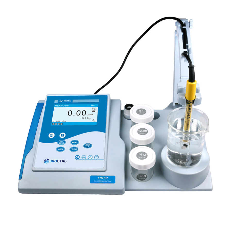 Стационарный кондуктометр ЕС21хх создан для измерения удельной электропроводности, солености, температуры. Модель серии 2100 считается надежной, простой в использовании, она имеет функцию автоматически настраиваемой или ручной температурной компенсации, которая срабатывает в диапазонах от 0 до 50° или от 0 до 110 °С. Есть системы автоматической диагностики и калибровки. Функция напоминания о датах калибрования у некоторых моделей отсутствует, но есть возможность проверки данных этого процесса у отдельных приборов. В число дополнений входят измерительный стенд, оснащенный держателем электрода, мешалка, поставляется с органайзером для растворов. В памяти хранится 50, 100 или 1000 записей, у некоторых моделей есть USB-подключение и цветной LCD или TFT-экран. Применим для изучения разных типов растворов и коллоидных систем. Характеристики кондуктометра EC2112