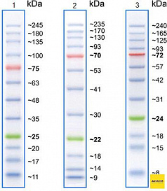 Содержат 11 белковых стандартов, три из которых (10, 40, 90 кДа) ковалентно связаны с голубым хромофором.