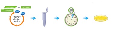 Простой (всего 3 стадии), быстрый (5’ при комн. температуре) и надёжный (до 95% клонов со вставкой) способ клонирования. В основе метода – использование фермента топоизомеразы I, выполняющей функции рестриктазы и ДНК-лигазы. Клонирование вставки в векторную плазмиду серии TOPO происходит по специфическим сайтам, распознаваемым топоизомеразой I. |