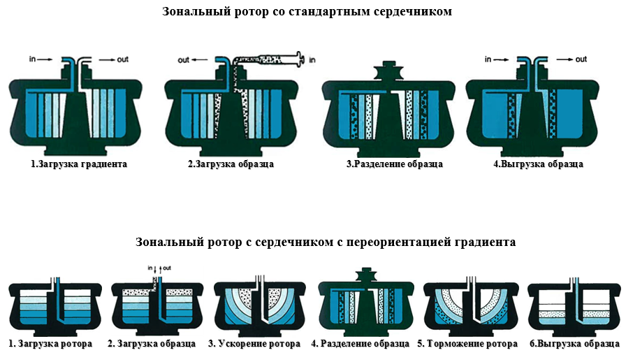 В начале работы градиент закачивается в ротор с помощью перистальтического насоса через уплотнительный узел для ввода и вывода исследуемого образца, далее загружается сам образец в центр ротора при этом ротор работает в режиме «загрузки» (2000 об/мин.) при использовании ротора со стандартным сердечником и в режиме полной остановки при использовании ротора с сердечником с переориентацией градиента. После загрузки ротор разгоняется до рабочей скорости, происходит разделение образца. По истечении необходимого времени центрифугирования из ротора выгружается образец, выгрузка происходит за счёт закачки в полость ротор вытеснительной жидкости.